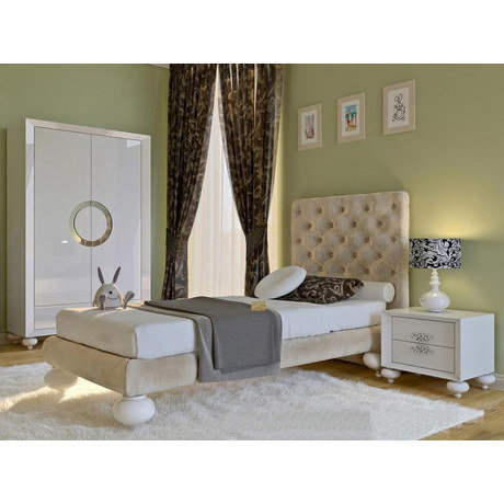 Односпальная кровать итальянского производства с изголовьем, обтянутым велюром, идеально подойдет как для детской, так и для спальни взрослого. Высокое изголовье украшает мелкая стежка-капитоне. Кровать поставляется с решеткой, без матраса. Размер спального места 90*200 см.