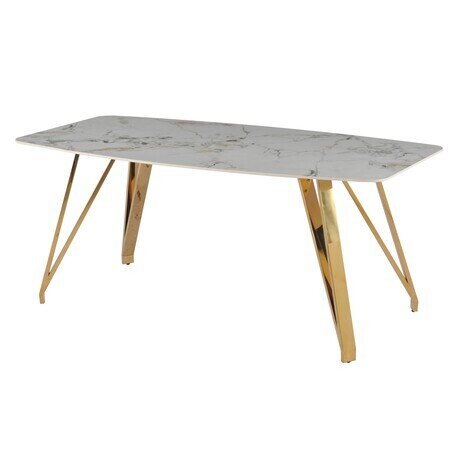 Стол обеденный. Столешница: керамогранит, цвет - белый мрамор с золотыми прожилками (Пандора). Основание: нержавеющая сталь, глянцевое золото180х90х76 см
