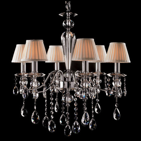 Люстра 6-ти рожковая на хромированной арматуре. Декор: элементы из прозрачного хрусталя. Плиссированные текстильные абажуры мягко рассеивают свет ламп, а классический дизайн станет украшением любой гостиной. Высота светильника регулируется за счет звеньев цепи.