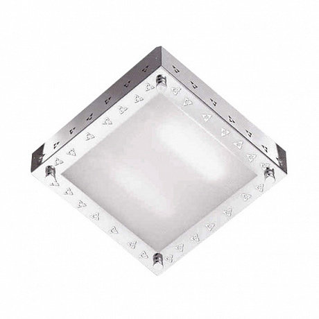 Настенно-потолочный светильник с матовым белым стеклом. Цвет арматуры - полированная сталь. Светильник украшен фигурным орнаментом. Количество лампочек: 1. Мощность: 1 x 9 Вт. Тип лампы: Люминесцентная, G23.